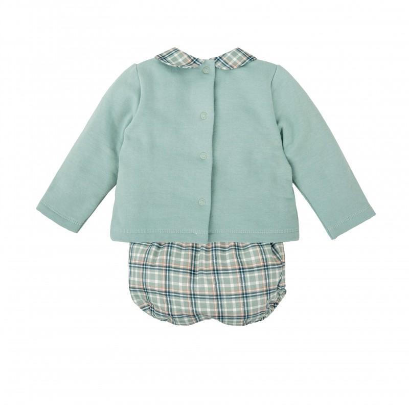 Un conjunto cómodo, simpático y con mucho estilo para los más pequeños. La camiseta de manga larga en tono verde agua presenta un bordado central de coche en tejido de cuadros, a juego con el cuello bebé redondeado y el cubrepañal.
