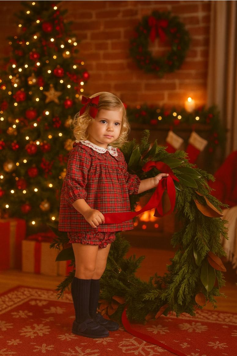 Este encantador jesusito de la colección otoño-invierno de Babidu es una opción ideal para vestir a las más pequeñas con estilo y calidez en los días más frescos. Confeccionado en un cálido tejido de cuadros tartán en tonos rojos, verdes y blancos, este conjunto destaca por su aire clásico y festivo, perfecto para ocasiones especiales o para dar un toque elegante al día a día.