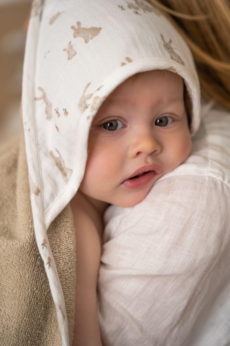 - Material: Toalla de rizo de algodón orgánico con capucha de muselina.