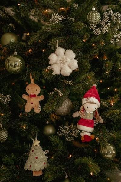 Añade un toque de ternura y magia a tu árbol con este encantador set de adornos navideños de Little Dutch. El conjunto incluye cuatro decoraciones blanditas: la muñeca Rosa en versión festiva, una galleta de jengibre, un árbol de Navidad y un copo de nieve.