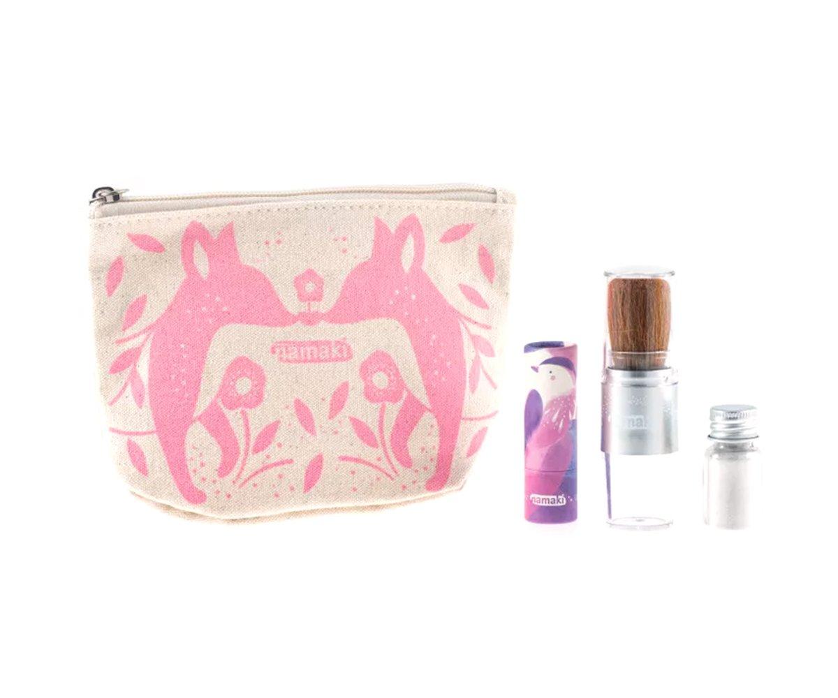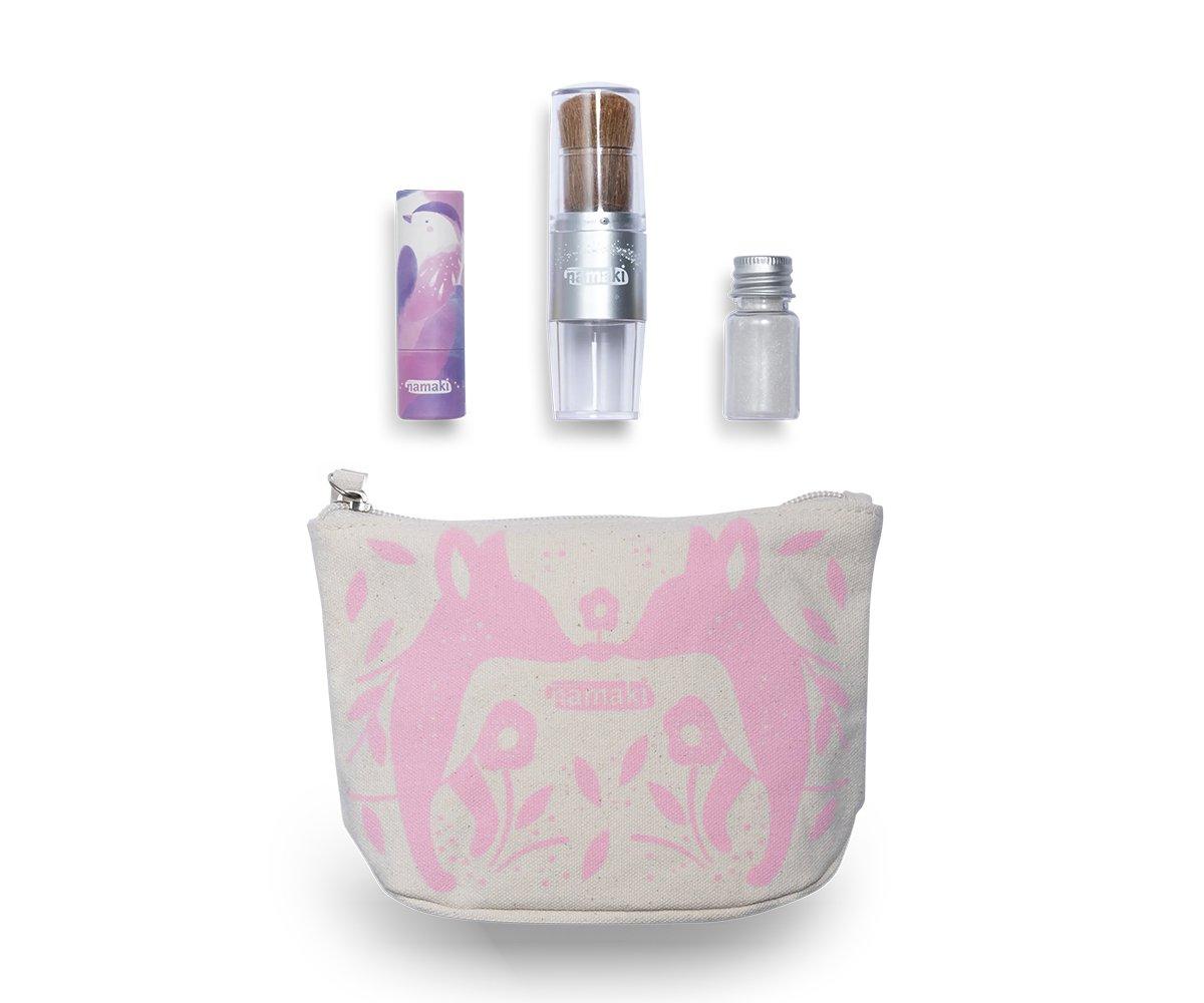El Estuche Rosa de Namaki es un set completo pensado para quienes buscan un maquillaje natural, seguro y con un acabado luminoso. Incluye un pincel mágico rellenable, polvos brillantes plateados y un bálsamo labial de frambuesa, presentados en una bolsa reutilizable de algodón orgánico.