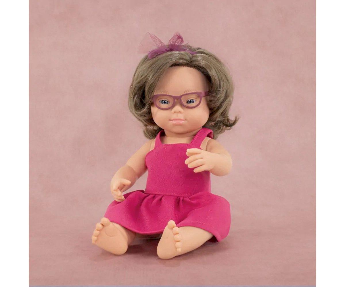 La muñeca con Síndrome Down de Miniland lleva puesto un vestido fucsia y gafitas y lacito a juego.Estos muñecos con Síndrome Down favorecen la comprensión de las normas básicas de relación y convivencia. ¡La mejor compañera de juegos y aventuras de tu peque!