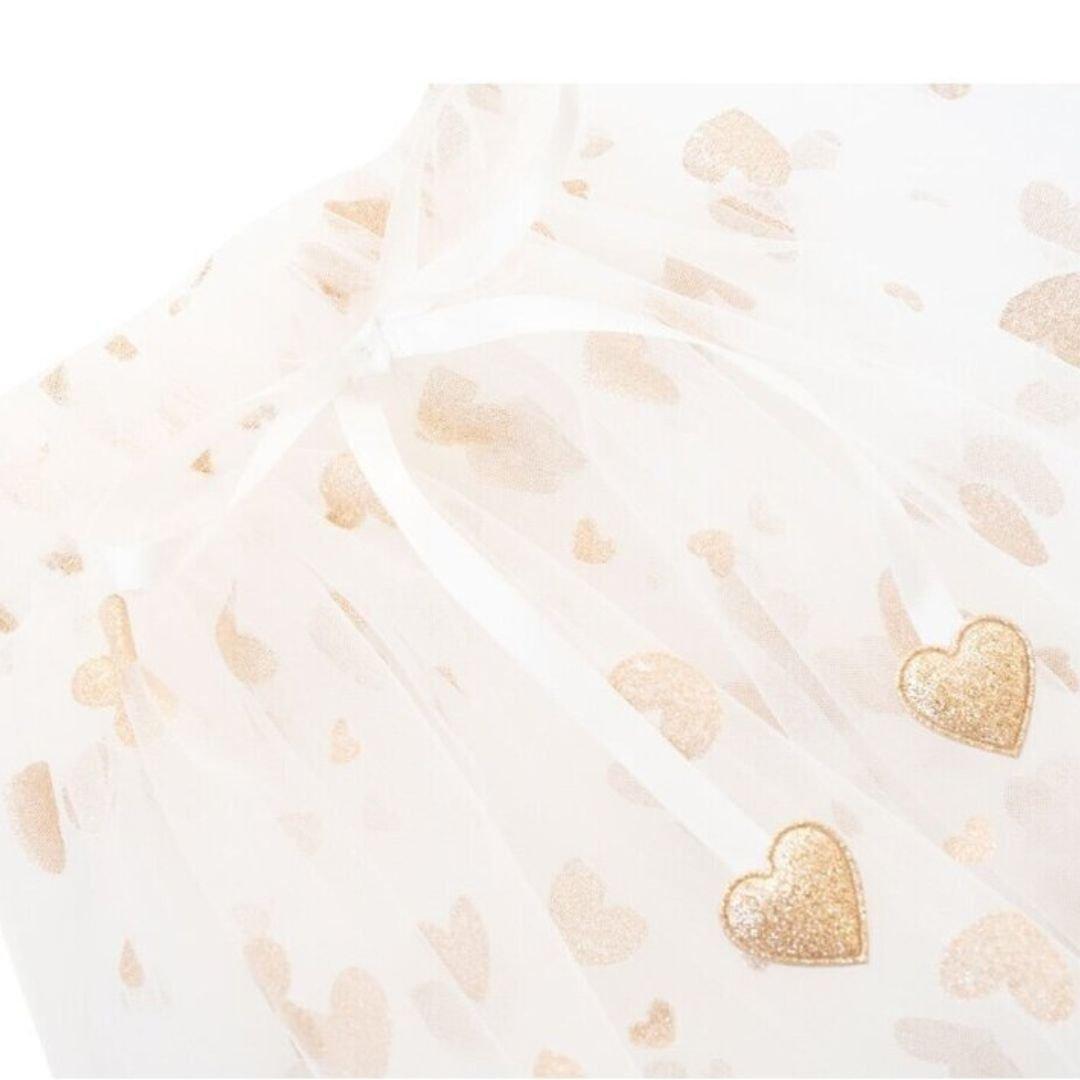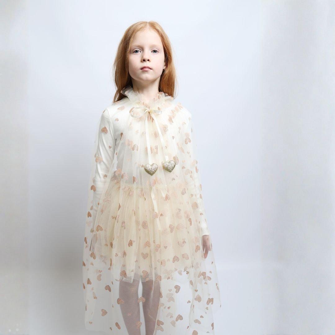 La capa mágica Loredana de Billy Loves Audrey es el complemento perfecto para dar vida a los juegos de fantasía de los más pequeños. Confeccionada en tul fino y ligero, destaca por su delicado estampado de corazones brillantes, que refleja la luz y aporta un efecto mágico y elegante.