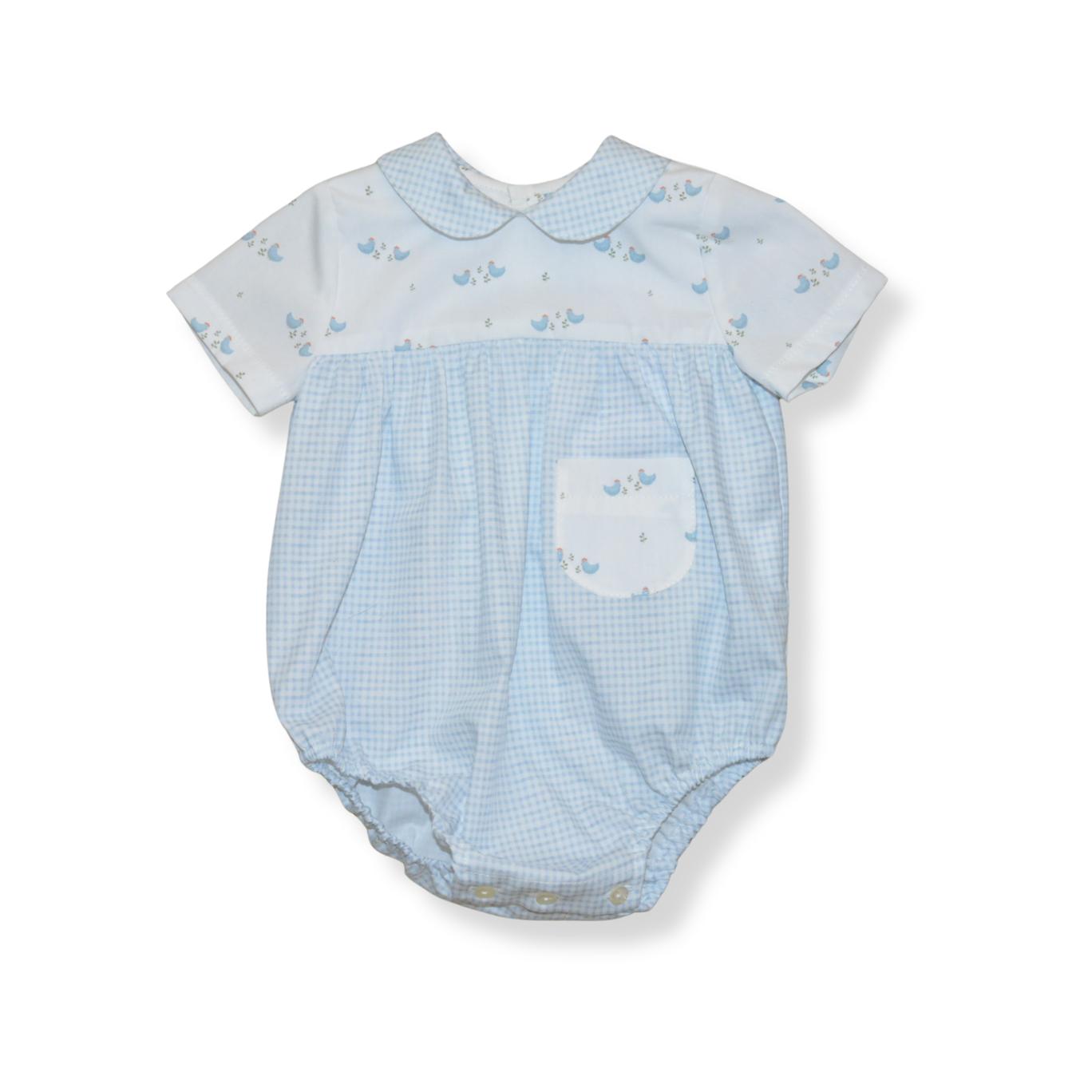 Pelele bebé vichy azul con estampado pollitos – Paloma de la O