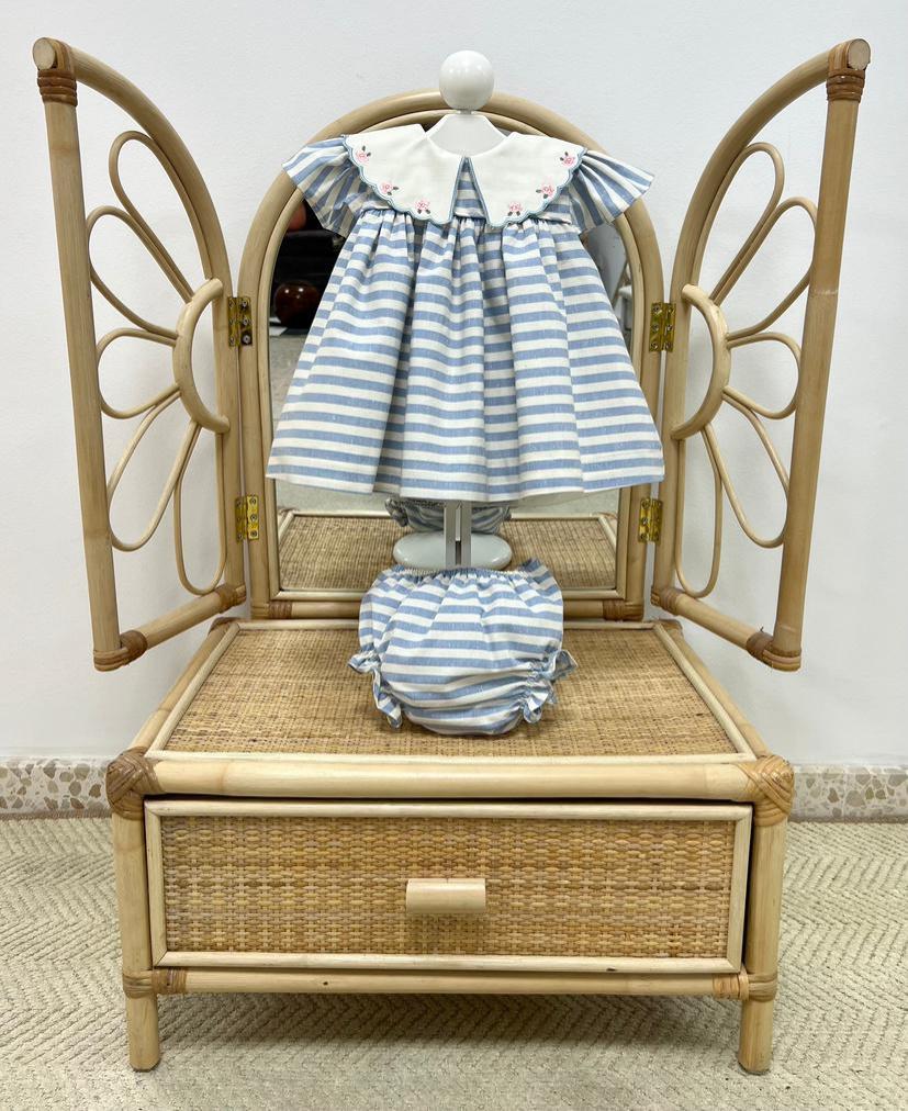 Este encantador conjunto para bebé de Maesu destaca por su estilo clásico y delicado, perfecto para vestir a las más pequeñas con elegancia durante los días más cálidos. El vestido presenta un bonito estampado de rayas en azul y blanco, un diseño atemporal que aporta frescura y dulzura al conjunto.