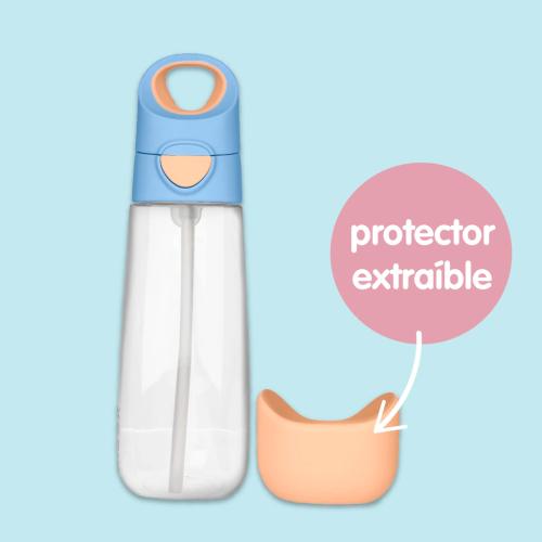 Incorpora una pajita de silicona integrada, que permite beber fácilmente sin necesidad de inclinar la botella. Su tapa con apertura mediante botón facilita el uso para los más pequeños, mientras que el sistema de cierre ayuda a mantener la pajita protegida cuando no se utiliza.