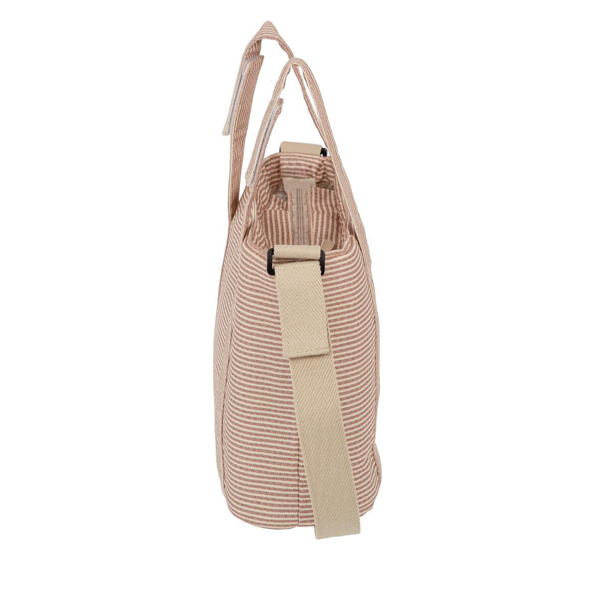 Su diseño combina estilo y versatilidad, incorporando un asa larga para llevarlo cómodamente al hombro o cruzado, además de dos asas cortas especialmente pensadas para colgarlo del manillar del cochecito.