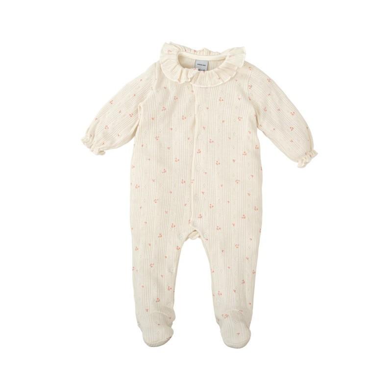 Pelele de bebé con pies confeccionado en suave punto canalé de algodón, con delicado estampado floral en tonos rosados sobre fondo marfil. Una prenda envolvente y confortable, perfecta para mantener al bebé abrigado con un estilo dulce y atemporal.