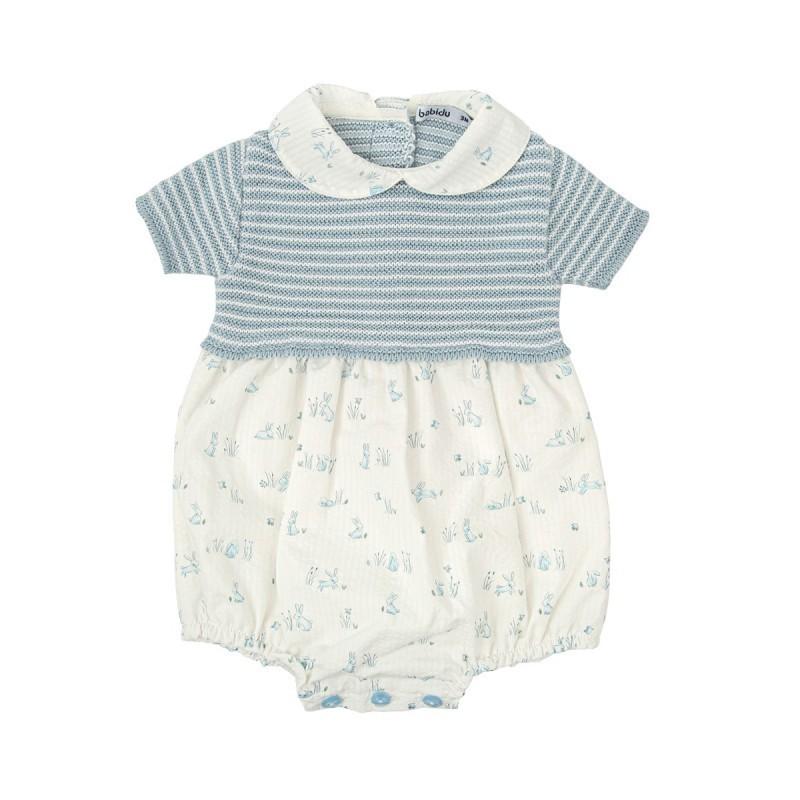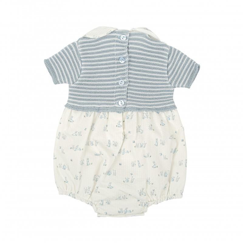 La parte superior en punto presenta un delicado diseño a rayas en tono azul suave, acompañado de un clásico cuello bebé en tejido estampado que aporta un acabado refinado. La parte inferior, en tejido ligero con pequeños motivos, garantiza frescura y libertad de movimiento, ideal para los meses más cálidos.