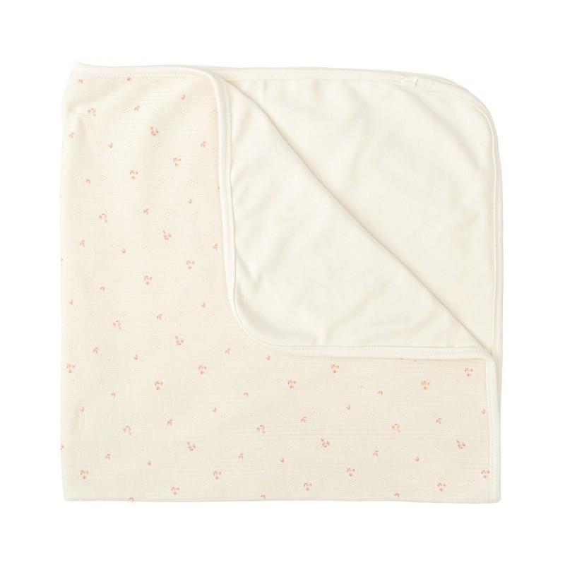 Manta de bebé confeccionada en suave algodón, con delicado estampado floral en tonos rosados sobre fondo marfil. Un diseño dulce y atemporal, perfecto para arropar al bebé con confort desde sus primeros días.