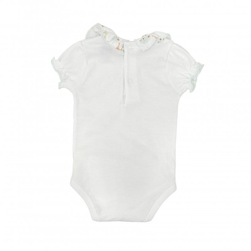 El body en color blanco destaca por su cuello redondo con volante en tejido estampado y mangas con pequeño volante, aportando un acabado dulce y muy cuidado. El cubrepañal, con estampado infantil de inspiración natural, completa el conjunto con un diseño alegre y armonioso, gracias a su cintura y perneras elásticas que garantizan un ajuste cómodo.