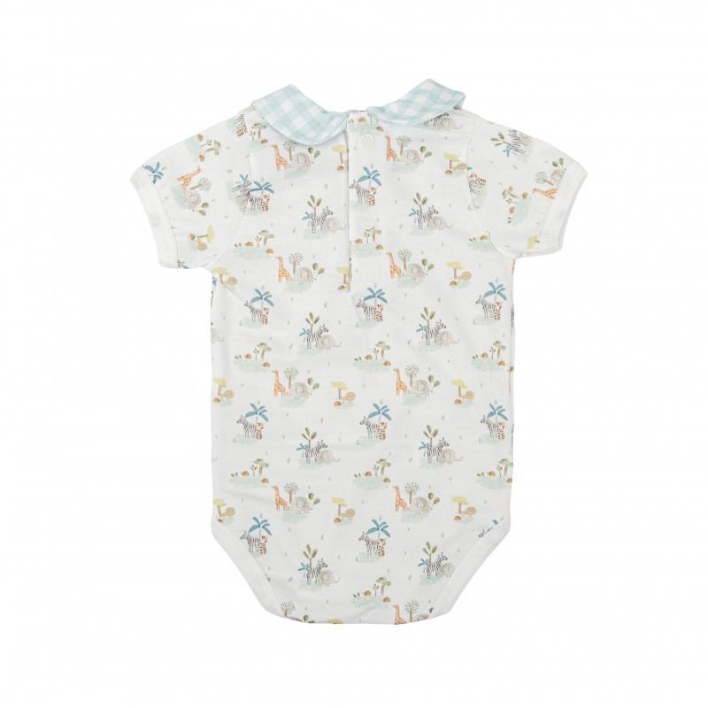 El body presenta un delicado estampado infantil de inspiración natural y un elegante cuello bebé en tejido de cuadro vichy verde agua, que aporta un acabado cuidado y armonioso. El cubrepañal, en tejido vichy a juego, cuenta con cintura y perneras elásticas para un ajuste cómodo y seguro.