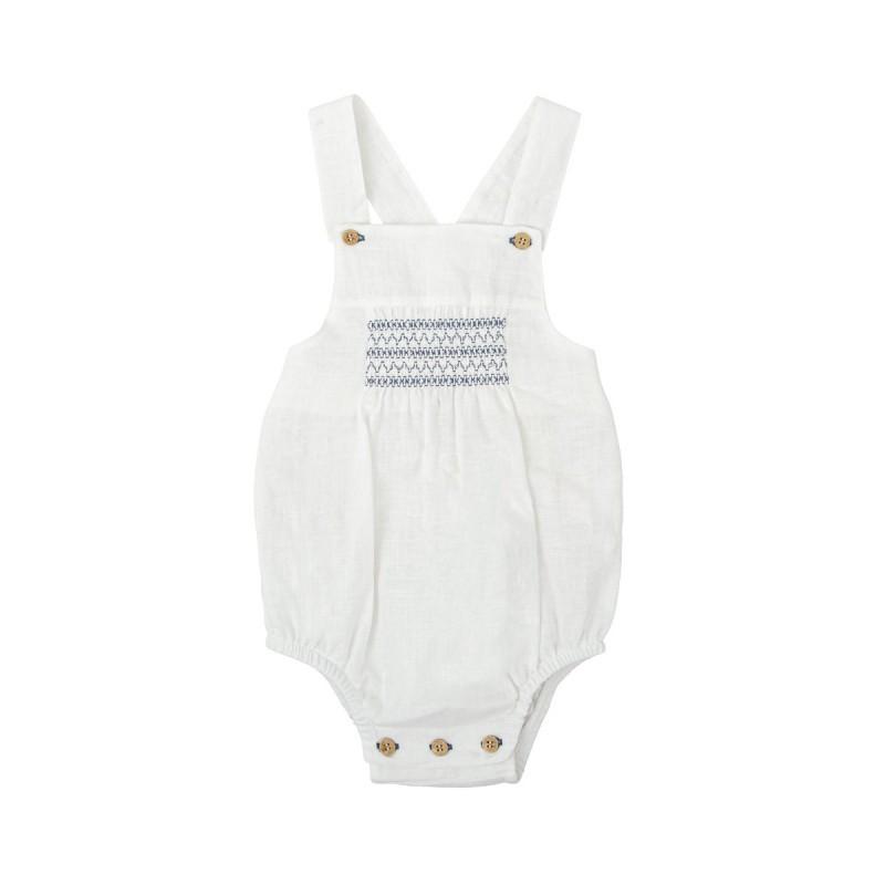 Destaca el delicado detalle de nido de abeja en el pecho, que aporta un toque artesanal y refinado. Los tirantes con botones y el fruncido en la cintura y perneras garantizan un ajuste cómodo, permitiendo libertad de movimiento en todo momento.