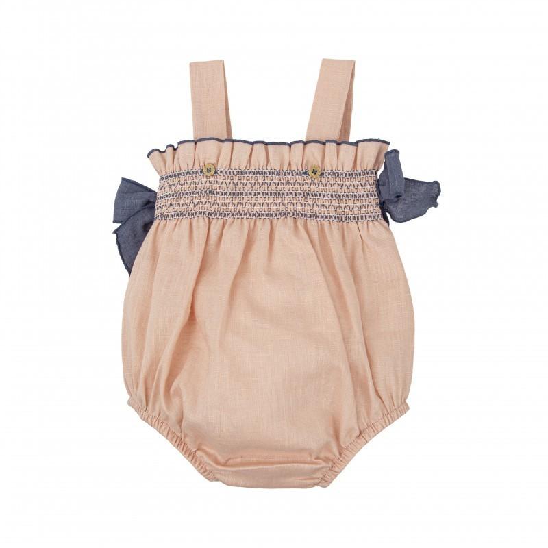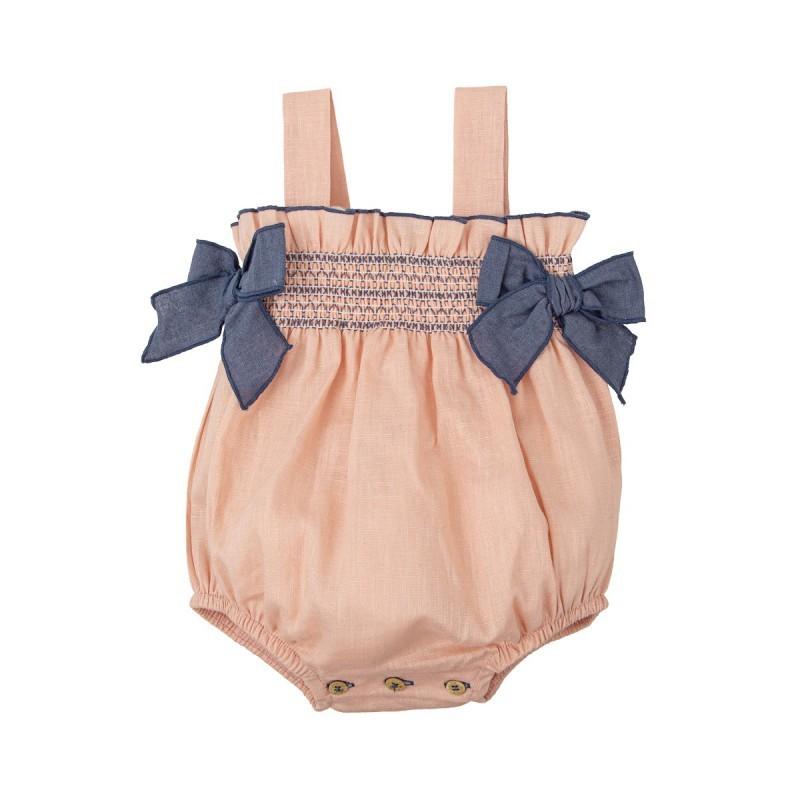 Destaca por sus tirantes y los lazos decorativos en los laterales, que añaden un toque especial y distintivo. El fruncido en las perneras y su confección en algodón garantizan comodidad, suavidad y total libertad de movimiento para el bebé.