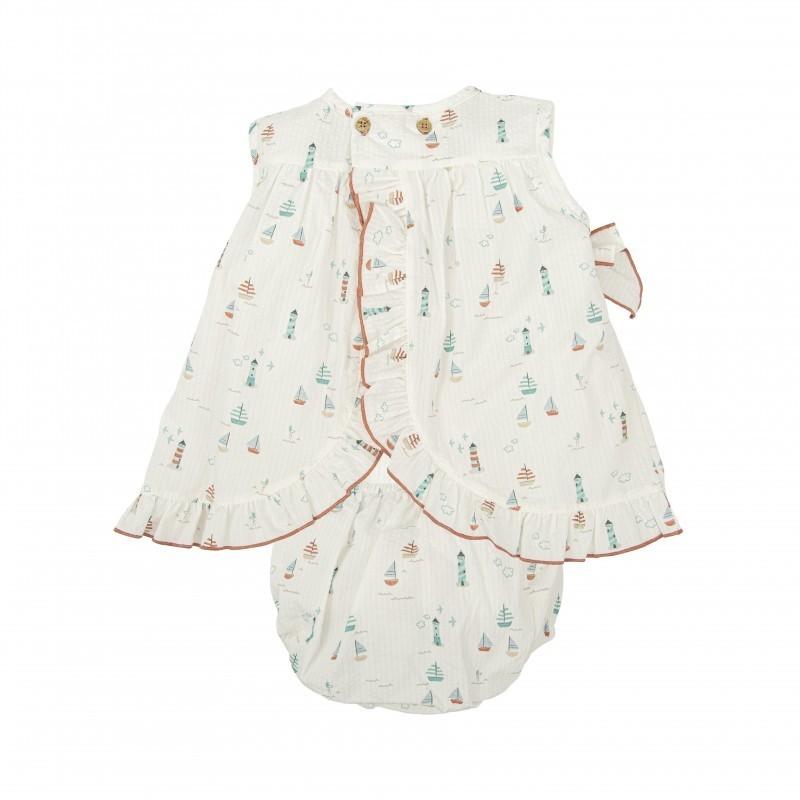 Este conjunto de bebé niña Babidu es una propuesta fresca y elegante, ideal para los días de verano. Su delicado estampado marinero con barcos y faros aporta un aire dulce y atemporal, perfecto para los meses más cálidos.