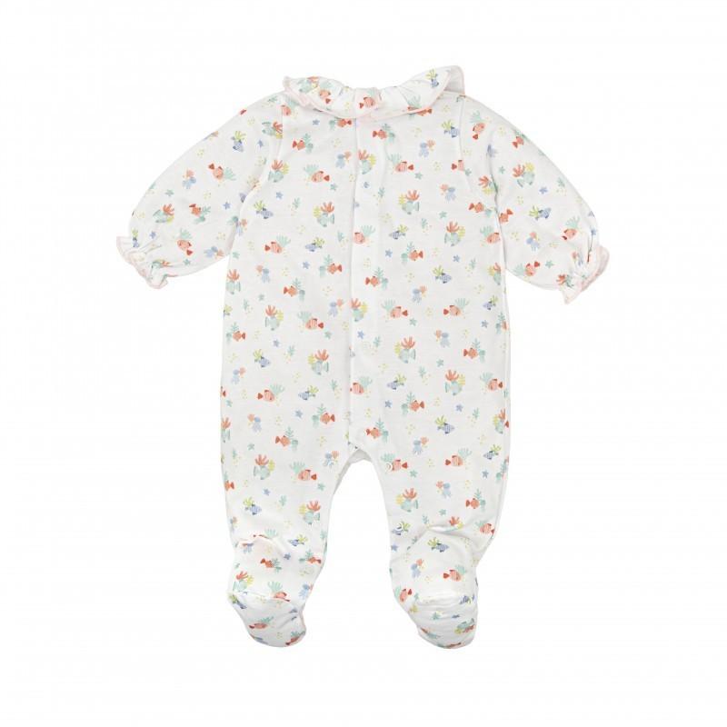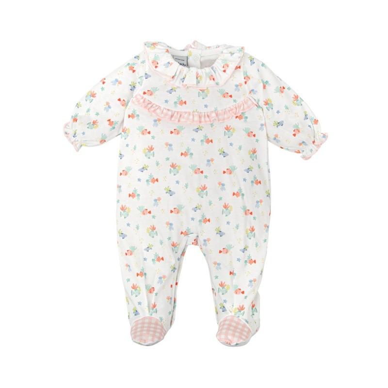 Este pelele de bebé niña Babidu está confeccionado en algodón suave y delicado, ideal para la piel sensible del recién nacido. Su alegre estampado marino con peces, estrellas y coral en tonos suaves aporta un estilo dulce y luminoso, perfecto para los primeros meses.