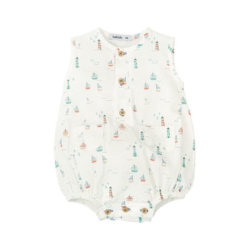 Esta ranita de bebé niño Babidu es una prenda fresca y cómoda, ideal para los días de verano. Su delicado estampado de inspiración marinera con barcos y faros aporta un estilo dulce y veraniego, perfecto para los primeros meses.