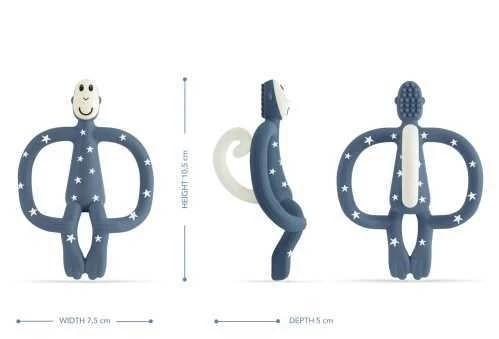 En la parte posterior de la cabeza del monito se encuentran unas pequeñas cerdas de silicona que permiten aplicar gel calmante, masajeando suavemente las encías y proporcionando un efecto reconfortante. Además, este diseño divertido convierte al mordedor en un compañero inseparable para el bebé.